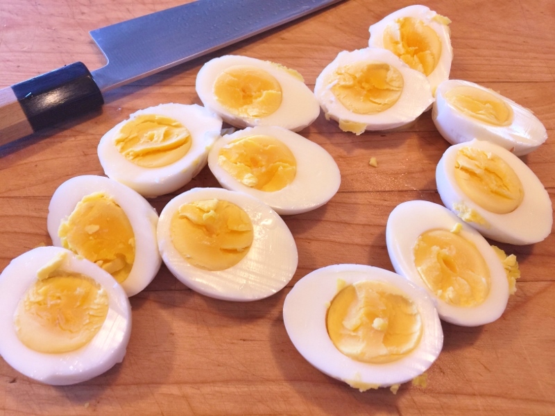 1. Slice eggs in half and place yolks in a stand mixer or large bowl. Mince bacon until coarse crumbs.
