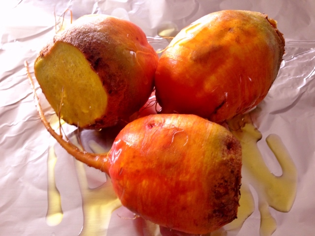 1. Preheat oven to 400 degrees. Wash and scrub beets and place them in foil with a drizzle of olive oil. Wrap foil tightly around beets and place them in oven to roast for about , or until fork tender.