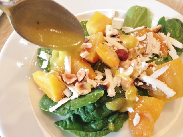 5. Toss greens, with beets, hazelnuts and cheese. Drizzle with vinaigrette and serve. Enjoy!