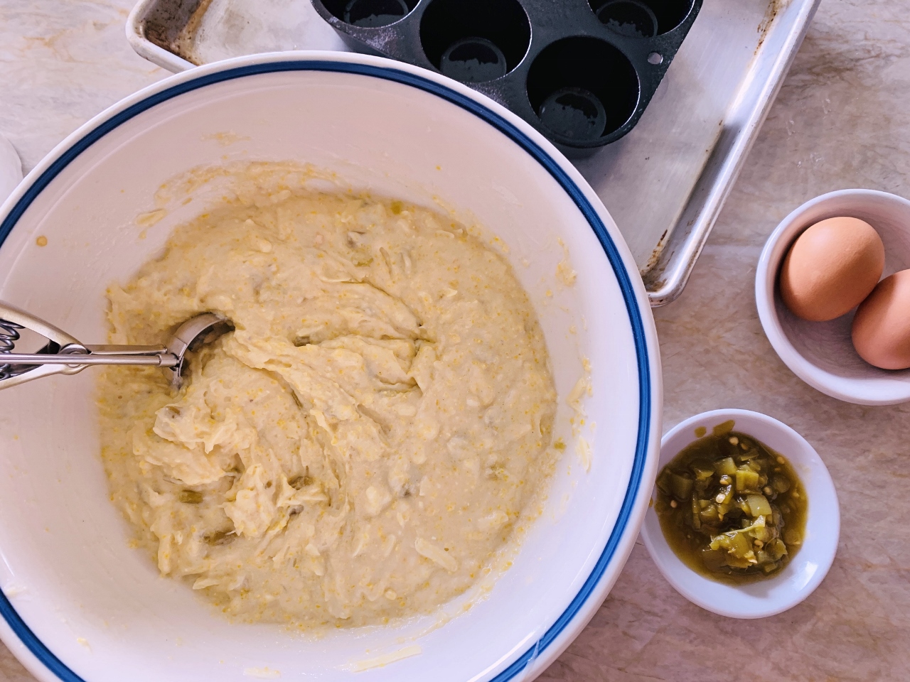 3. Make a well in center, add eggs, butter and oil, whisk to combine.  Add 3/4 cup cheese, and 3 ounces of chilies, stir to combine.