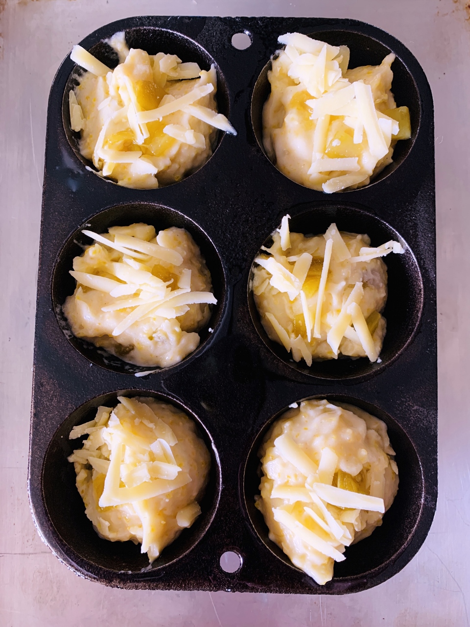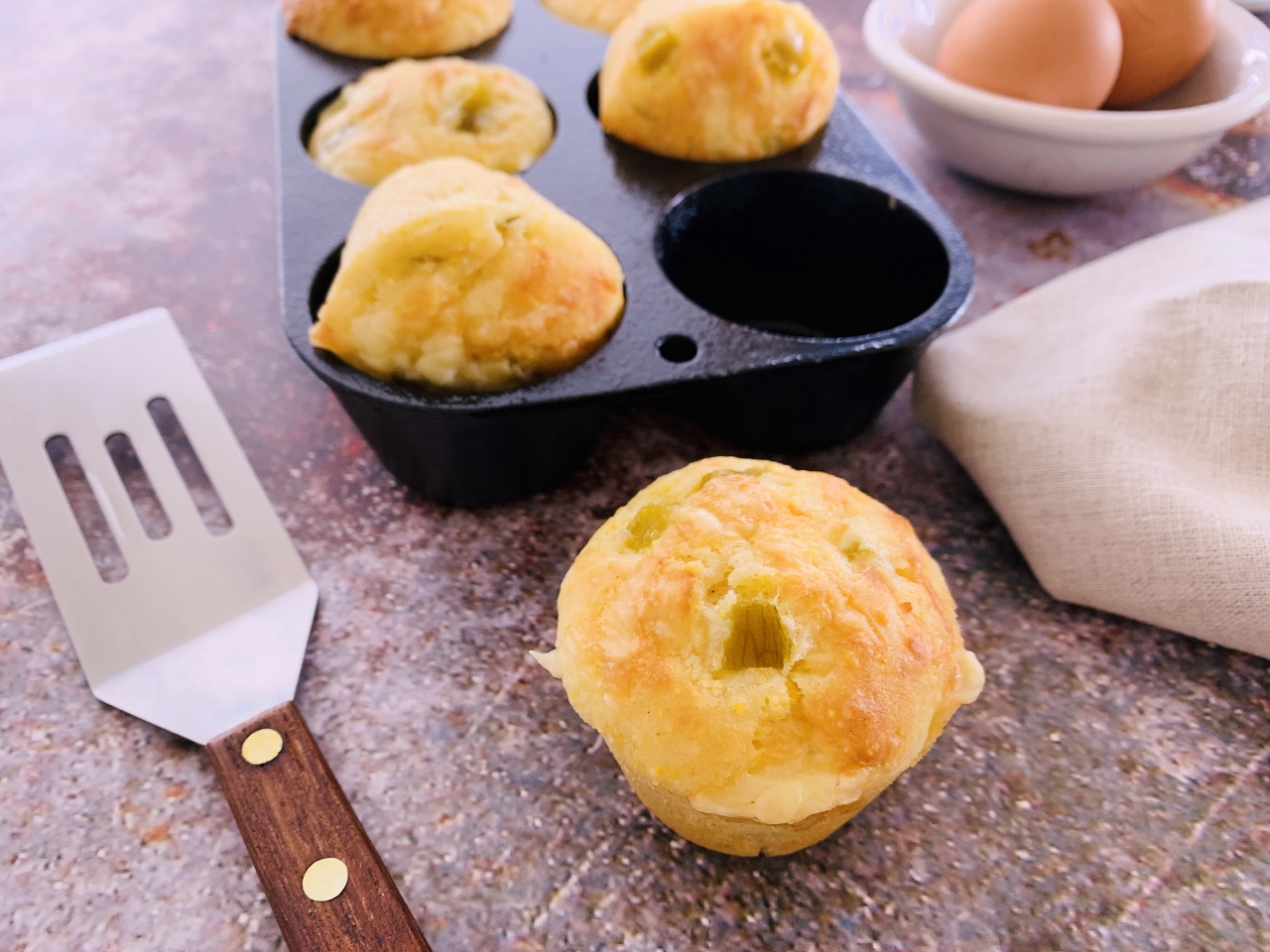 4. Spoon into prepared pan and sprinkle with remaining chilies and cheese.  Bake for 22-24 minutes or until golden brown on top.  Remove and let cool for 10 minutes, before inverting onto a rack to cool completely.  Serve alongside soups, stews, chili or eat all by themselves.  Enjoy!