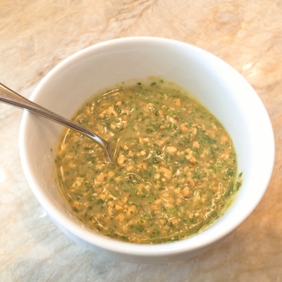 2. Â In a food processor or blender, add all Sauce ingredients, except olive oil and puree for 30 seconds. With the processor running, slowly drizzle in olive oil. Â Place sauce in a bowl and reserve until later.