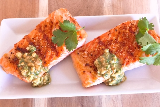 This salmon recipe is super flavorful and easy to prepare – a quick dry rub for the fish and a puree of nuts, mustard and cilantro creates a zesty sauce for the fish. Â The Cilantro Peanut Sauce is slightly chunky, with flecks of herbs throughout – a nice contrast to the smoky grilled salmon.