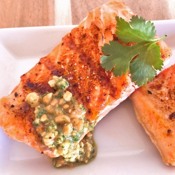 This salmon recipe is super flavorful and easy to prepare – a quick dry rub for the fish and a puree of nuts, mustard and cilantro creates a zesty sauce for the fish. Â The Cilantro Peanut Sauce is slightly chunky, with flecks of herbs throughout – a nice contrast to the smoky grilled salmon.