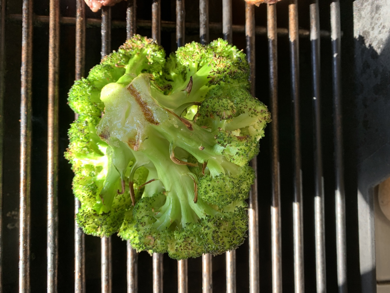 3. Preheat grill to 40o degrees.  After 15 minutes, place broccoli on grill and sear on all sides, about 8 minutes total.