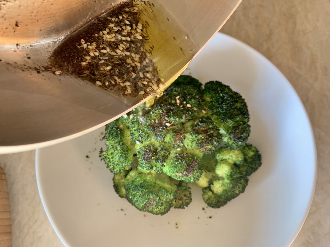 2. In small saucepan over low heat, add olive oil and Za’atar.  Warm oil and leave on simmer, while you grill broccoli.