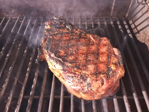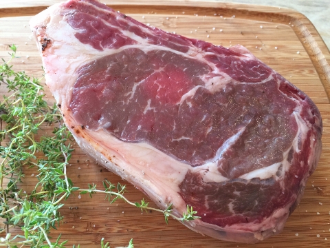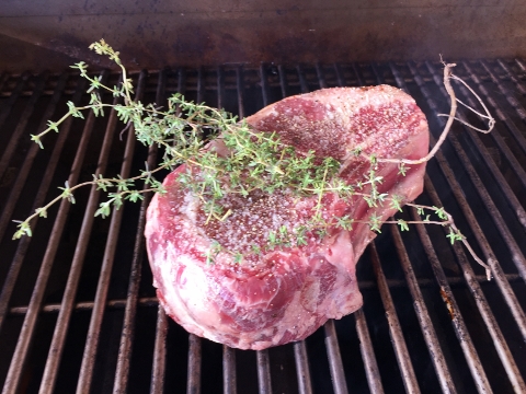 4. Place the ribeye on the grill with a sprig on thyme on top. I think the herbs infuse into the meat as it cooks, this is optional. Cook the first side of the steak for about 8 minutes, cooking time is dependent on how you prefer your steak.
