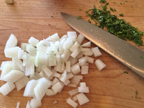 2. Wash and dry Padron peppers. Cut the onion into a large dice and mince the herbs.