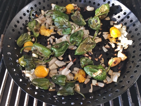 5. Flip the steak over, removing the herbs and continuing to grill for at least 7 more minutes. Grill the steak longer, if you like your steak more done. Then, add the Padron pepper mixture to the grill when you begin cooking the second side of the steak.