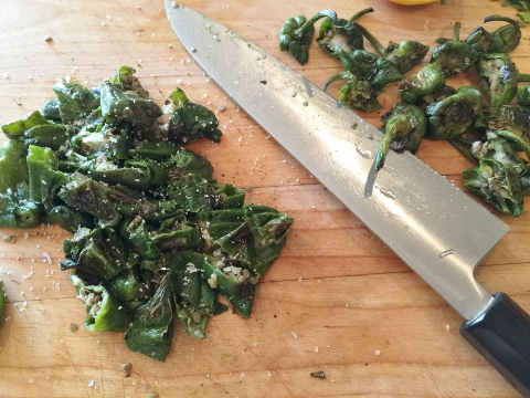 The Padron pepper relish is prepared on the grill too, adding a slight char to the vegetables. After the veggies are grilled, they are chopped and tossed with herbs and a squeeze of lemon. The fresh flavors of the relish cut through the the heartiness of the ribeye and I like to serve this steak with a fresh salad.