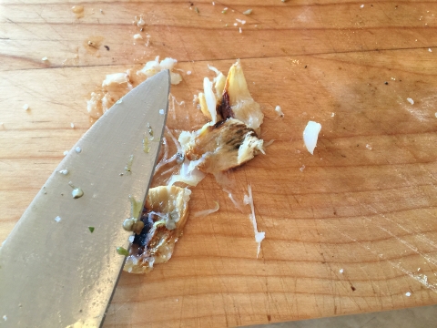 8. Spoon the grilled onions and tomatoes into the bowl with the peppers and stir to combine. Smash the grilled garlic with a knife with a pinch of salt and add it to the relish mixture. Salt and pepper the relish to taste and drizzle with 1 tablespoon of olive oil, stir again.