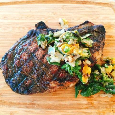 9. Serve the Ribeye with the Padron Pepper Relish. Enjoy!