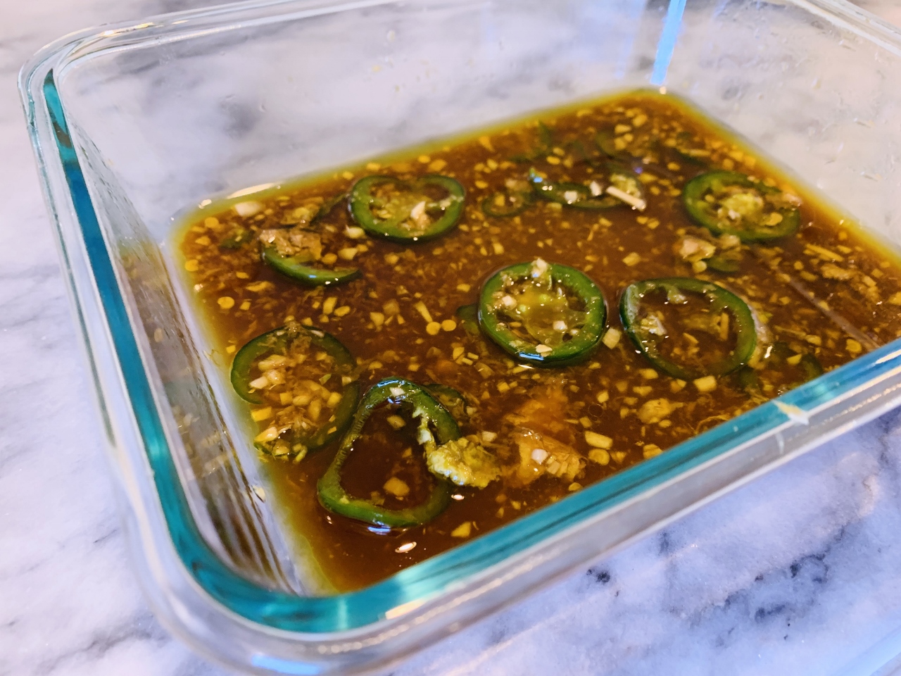 Marinating meat before it hits a hot grill adds so much enjoyable taste and texture, but using it as a sauce afterwards, gives it another delightful bonus in my book. Usually after we marinate meat, chicken, or fish, we toss away the marinade because it has been exposed to a raw product, but if we cook it down in a saucepan, it’s perfectly safe and most delicious to use. Asian flavored marinades are perfect candidates for this practice because they are loaded with pantry items like ginger, garlic, soy sauce and in this recipe, jalapenos, which cook down into a scrumptious sauce.