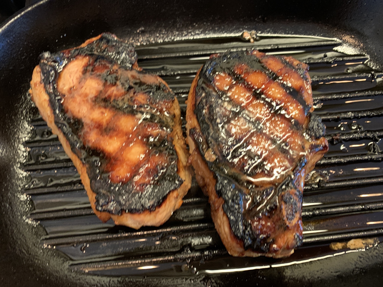 - Remove chops from marinade and pat dry with paper towels. Heat grill or grill pan until hot, about 400 degrees. Pour marinade in saucepan and place over low heat until simmering.