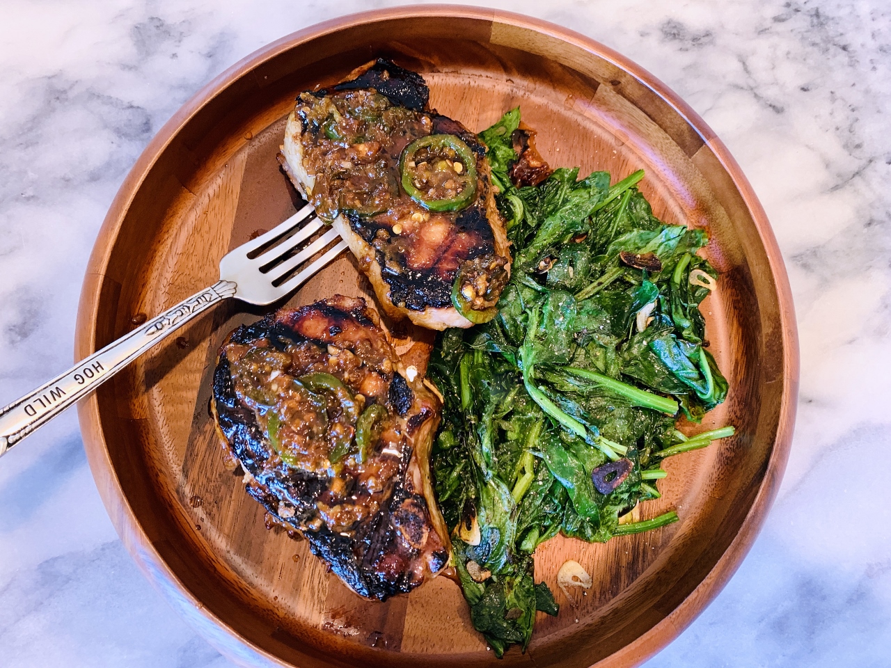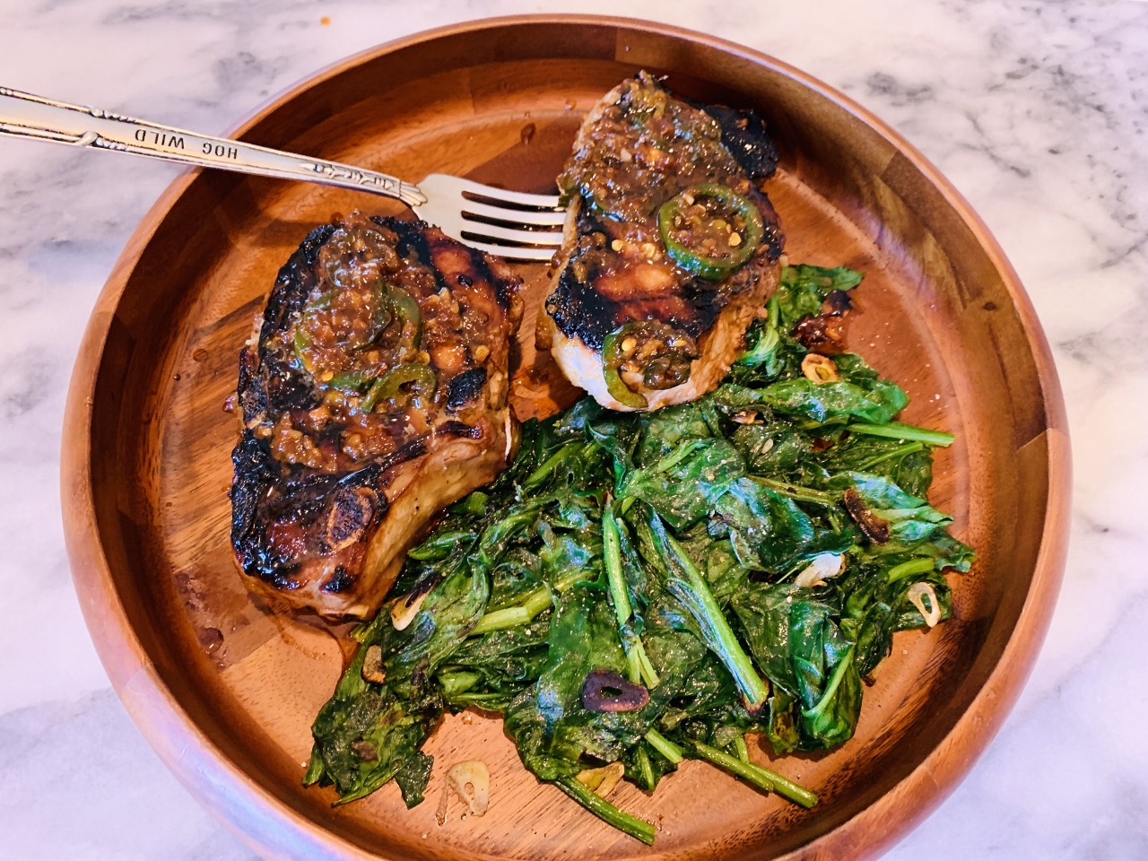 In this recipe I used a grill pan, because I don’t have a grill set up in my Santa Ynez home just yet, but you can cook these chops up in minutes on an outdoor grill. The marinade just needs to be reduced slightly on the stove top and can be done, while your chops are cooking. Garlicky sautéed spinach was my side dish with these substantial chops, giving them nice balance with each bite. You can double the chops in recipes for larger groups or gatherings.
