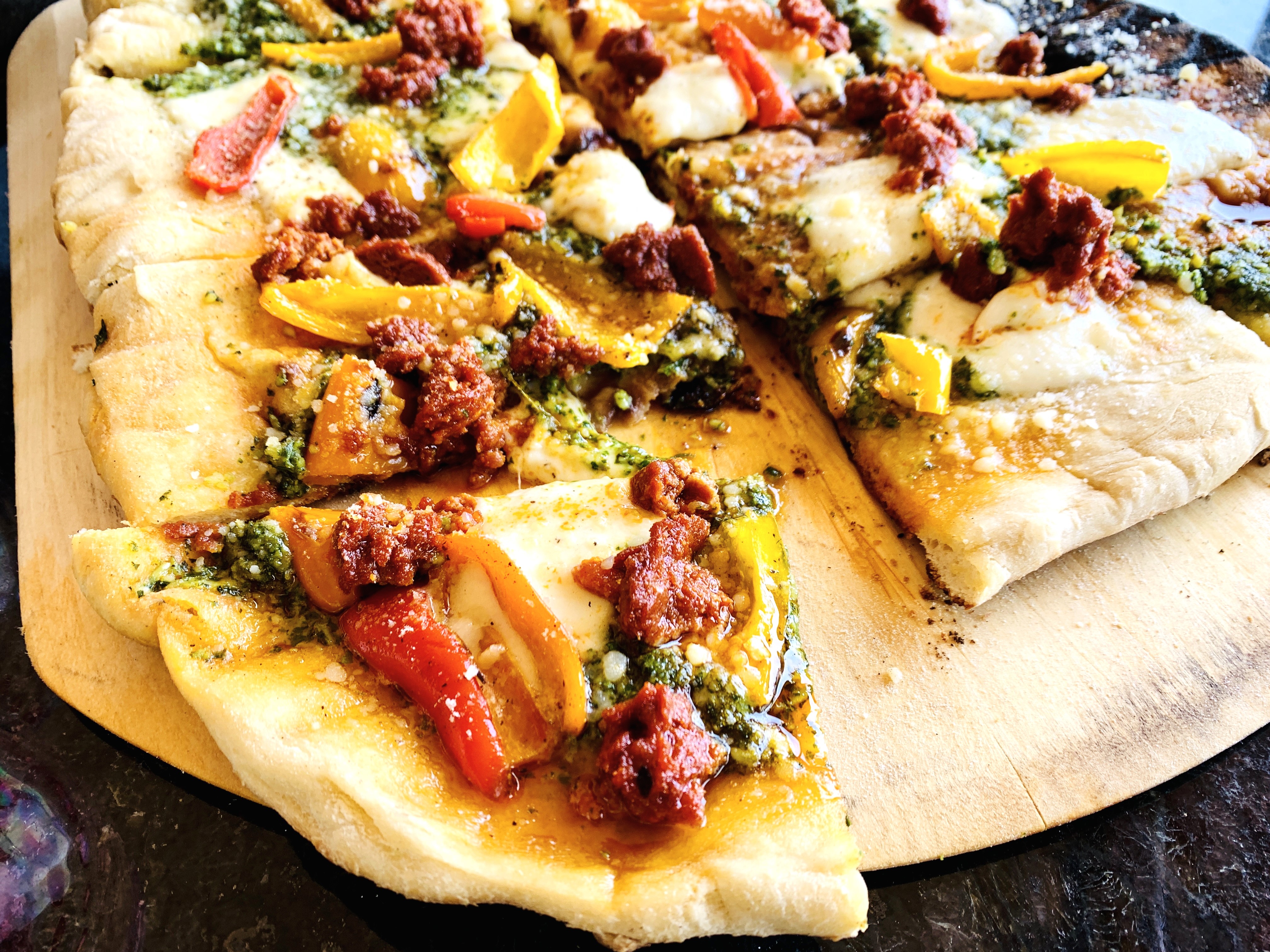 Pizza doesn’t always have to be made in a fancy wood-fired oven or on a sheet pan at high temperatures to be be delicious. You can make it right on the grill and my Grilled Pesto Pizza with Sweet Peppers, Nduja (Sausage) and Mozzarella is stupendous.