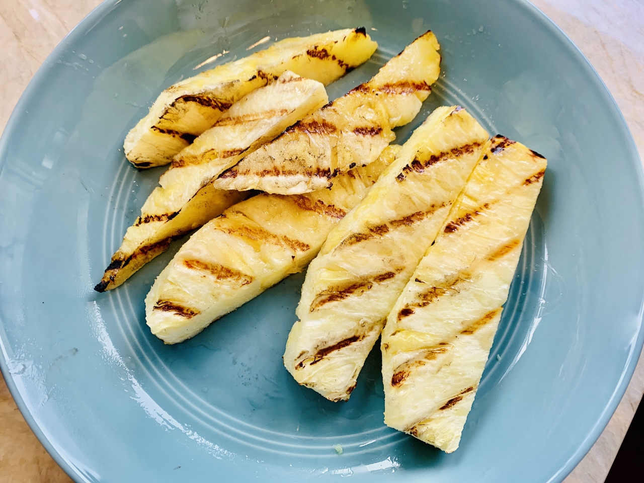 Grilling fruit is a easy task and can be done in minutes, either on your outside grill, or indoors on a grill pan. An outside grill probably adds a bit more smokiness, but if you don’t have one, a good grill pan can achieve similar flavors. Freshly sliced pineapple rubbed in a little oil, sears in a couple of minutes, and creates a look and taste that is reminiscent of summertime.