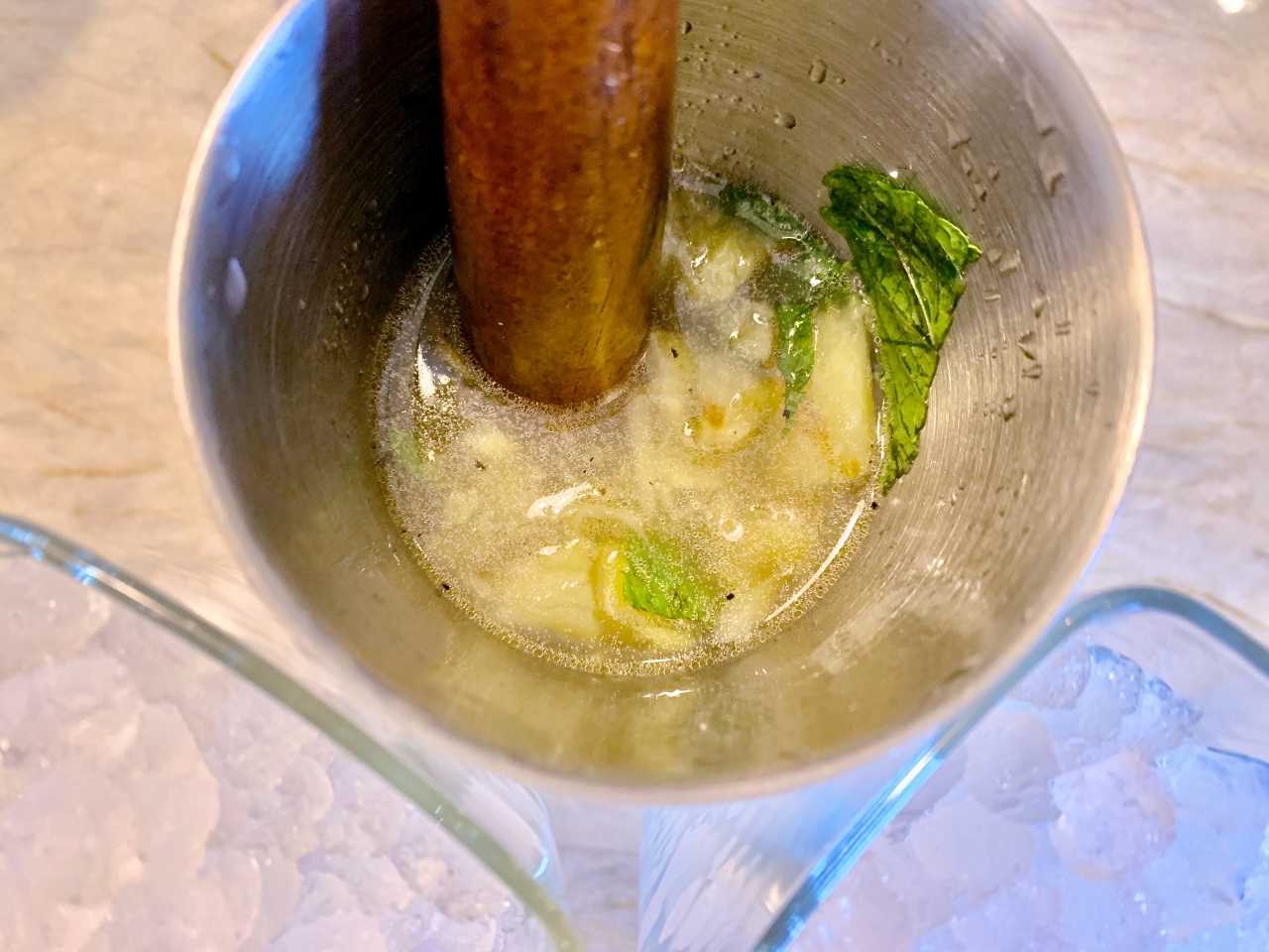 - In a cocktail shaker, add chunks of pineapple, mint leaves and simple syrup. Using a dowel or end of a wooden spoon, muddles mixture together to release juices and oils into each other.