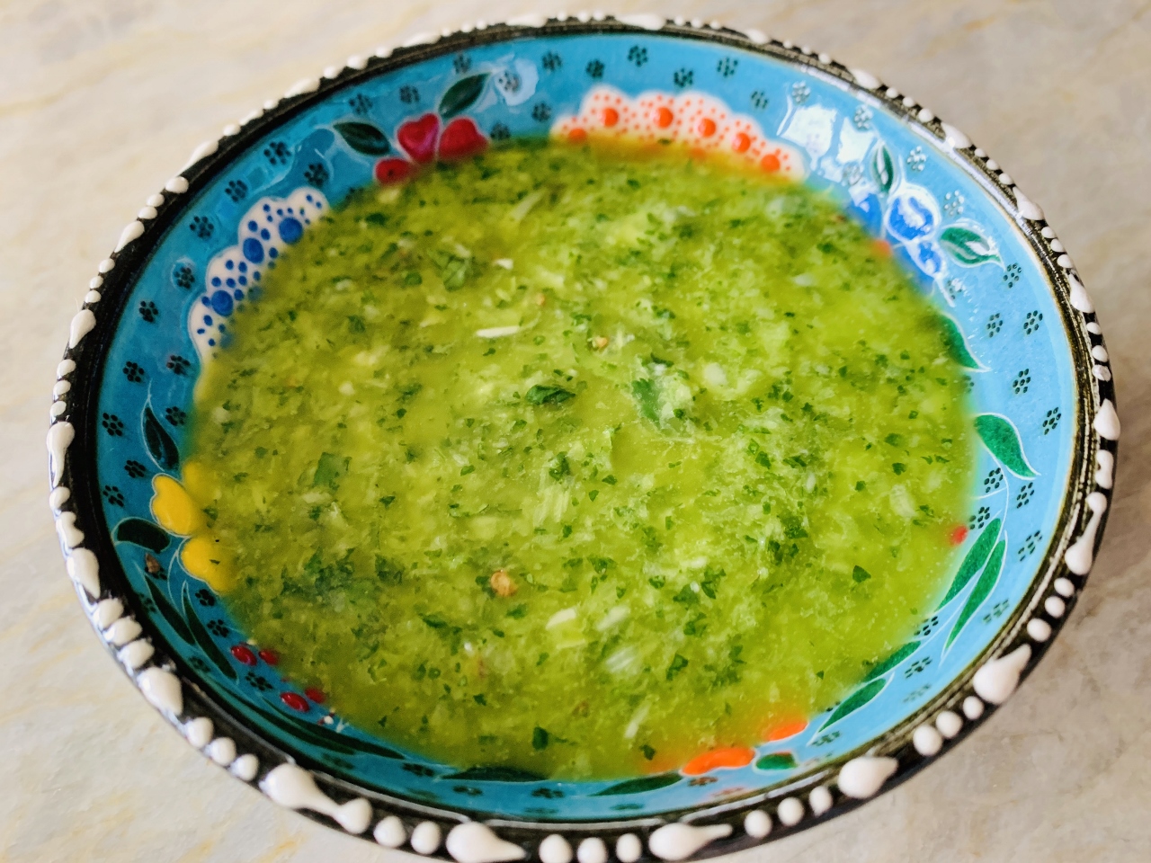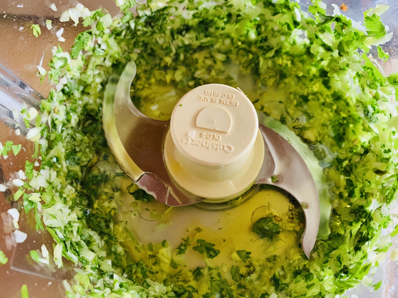 2. In a food processor add all Chutney ingredients, except oil and pulse until coarsely chopped.  Remove lid and add oil, pulse until slightly creamy, but still coarsely chopped, about 10 pulses.  Place Chutney in dish and set aside.