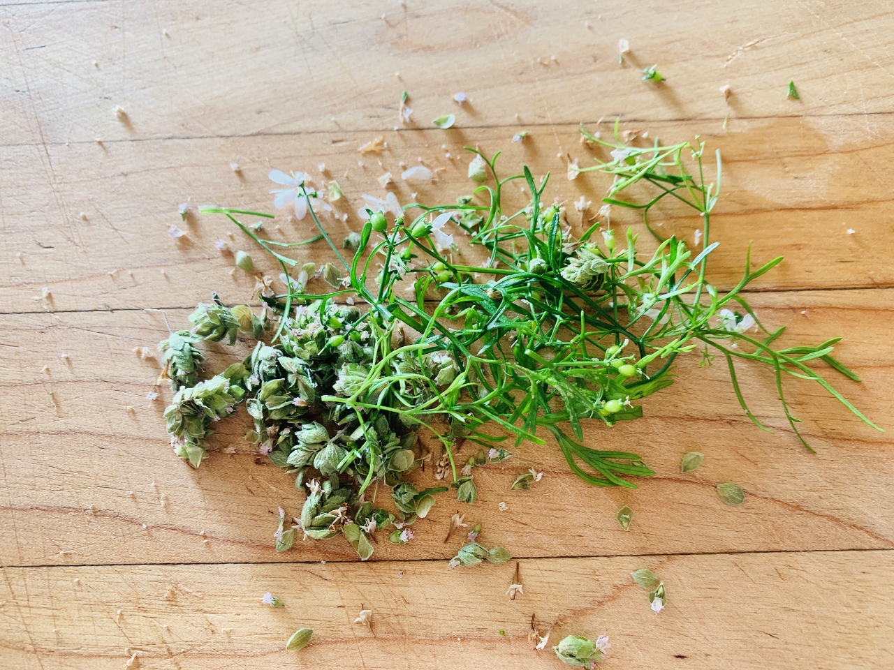 - Roughly mince herbs and flowers with a sharp knife, set aside.
