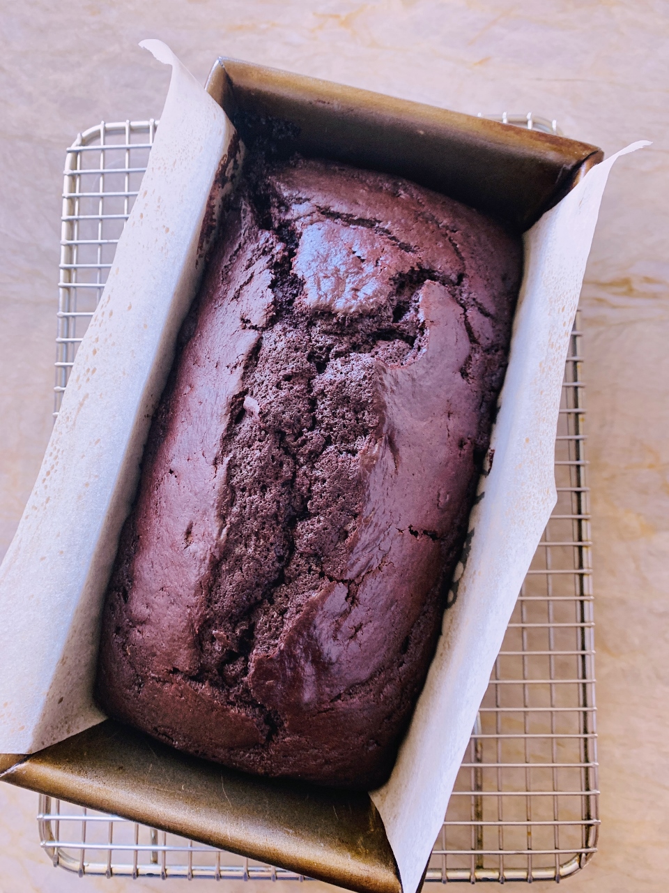 - Pour into prepared pan and bake for 50-55 minutes, or until a toothpick comes clean. Remove and let cool 20 minutes before inverting and moving to a wire rack to cool completely.