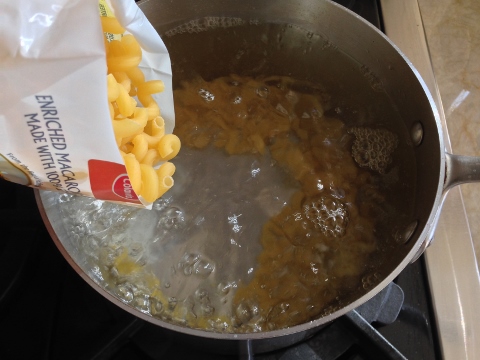 4.  Add cooked pasta to sauce and stir over low heat for 1 minute.  Pour pasta into a buttered oven safe 4-quart dish.