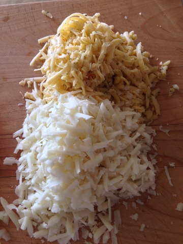 1.  Preheat oven to 375 degrees.  Boil a large pot of salted water and cook pasta until al dente, about 8 minutes.  Dice onion and shred cheeses for sauce.