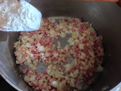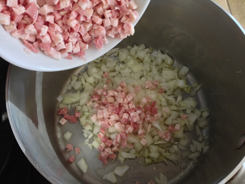 2.  In a large pan over medium heat, add 3 tablespoon of butter, onion and pancetta.  Cook for 4 minutes, until slightly softened.