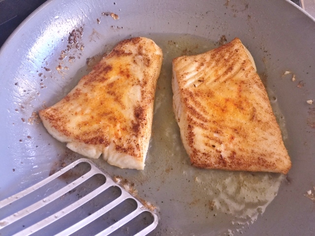 3. In a sauté pan over medium heat, add 1/4 cup of grapeseed oil. After 1 minute, add half fish fillets and cook on first side for 3 minutes. Flip over and turn the heat to medium-low and cook another 4 minutes. Place fillets on plate and cover with foil. Repeat cooking with remaining fish.