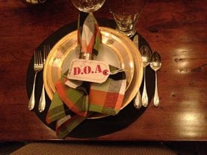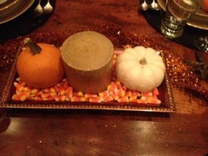 This Halloween throw a spooktacular dinner party.  We had one with some friends last Saturday night and it turned out great.  To start decorate your table with simple things from the grocery store like candles, candy corn, cob webs and mini pumpkins.  Next, use black placemats and dishes from your cupboard and don’t forget a clever name card and napkin which you can make by hand or find at your local craft store.