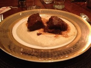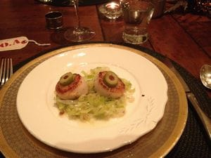 Now for the main courses — create delicious and creepy foods like beet salad with roasted witches finger (carrot), goblins eye balls with champagne and leeks (scallops with leeks and sliced pimiento olives) and flesh and blood of warlocks (short ribs in red wine sauce with pureed cauliflower).