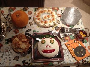 Start with a small table of appetizers that are fun and easy i.e. devilish eggs, spooky smoked salmon cheese ball and nibblies like nuts and pumpkin seeds.