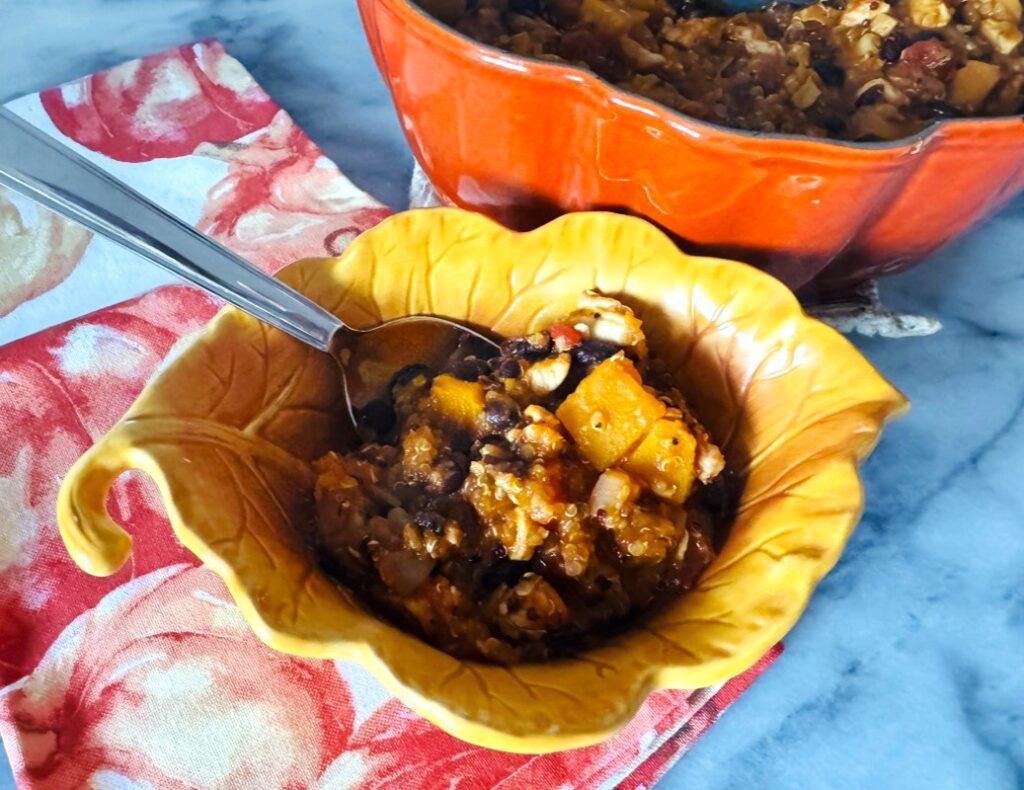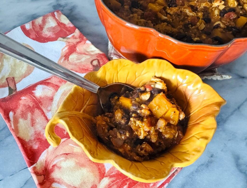 I enjoy all kinds of chili, not only because it’s heartwarming, but because it’s super easy to put together (or dump) into one big Dutch oven or pot. What makes this a harvest recipe is that it has fall-like flavors — butternut squash, pumpkin, black beans and chunks of chicken. Quinoa is the secret ingredient as it thickens so gracefully, offering a silkiness to the chili.