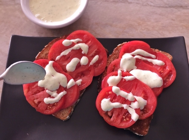 Toasts are super easy to prepare with either avocado, cheese, sliced deli meat, and especially sliced tomatoes. However, during summer I am more of a purest and enjoy heirloom tomatoes sliced on toasty bread all by themselves. I prepared a fresh thyme aioli or mayonnaise to drizzle over the top, which I make quite thin in consistency, so it doesn’t overpower the delicate tomatoes.