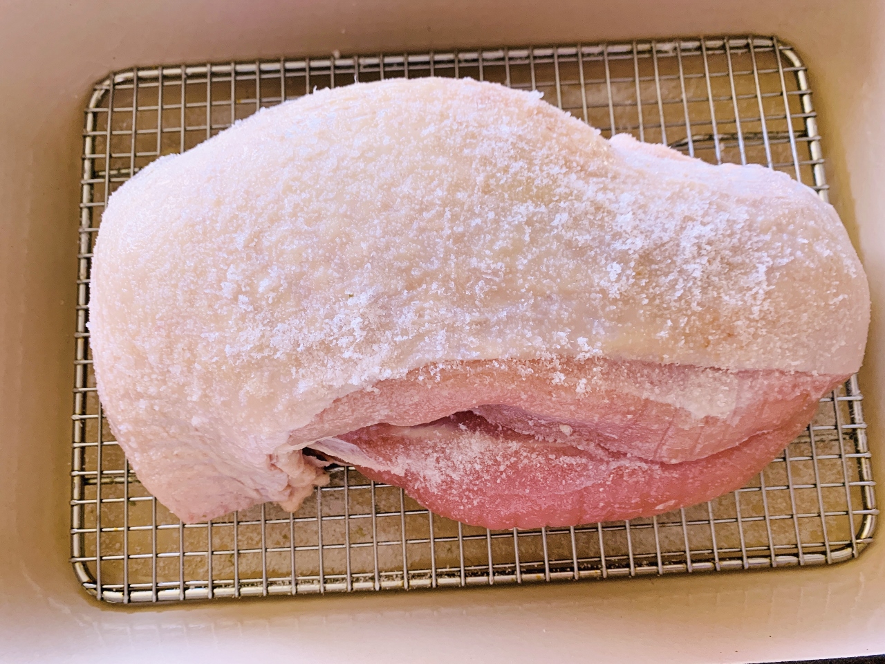 2. Remove turkey from refrigerator.  Using paper towels, brush off any excess salt, and wipe pan clean underneath turkey.  Preheat oven to 425 degrees.