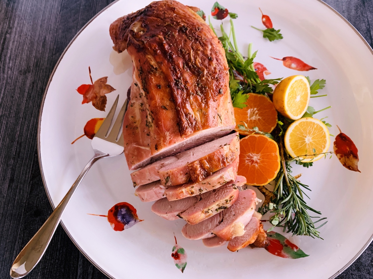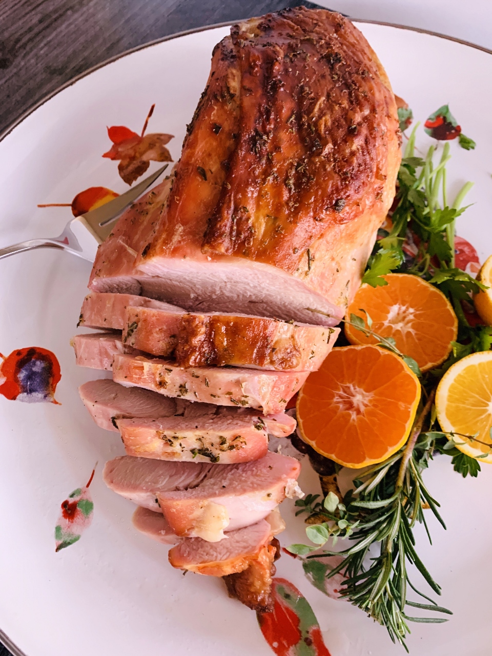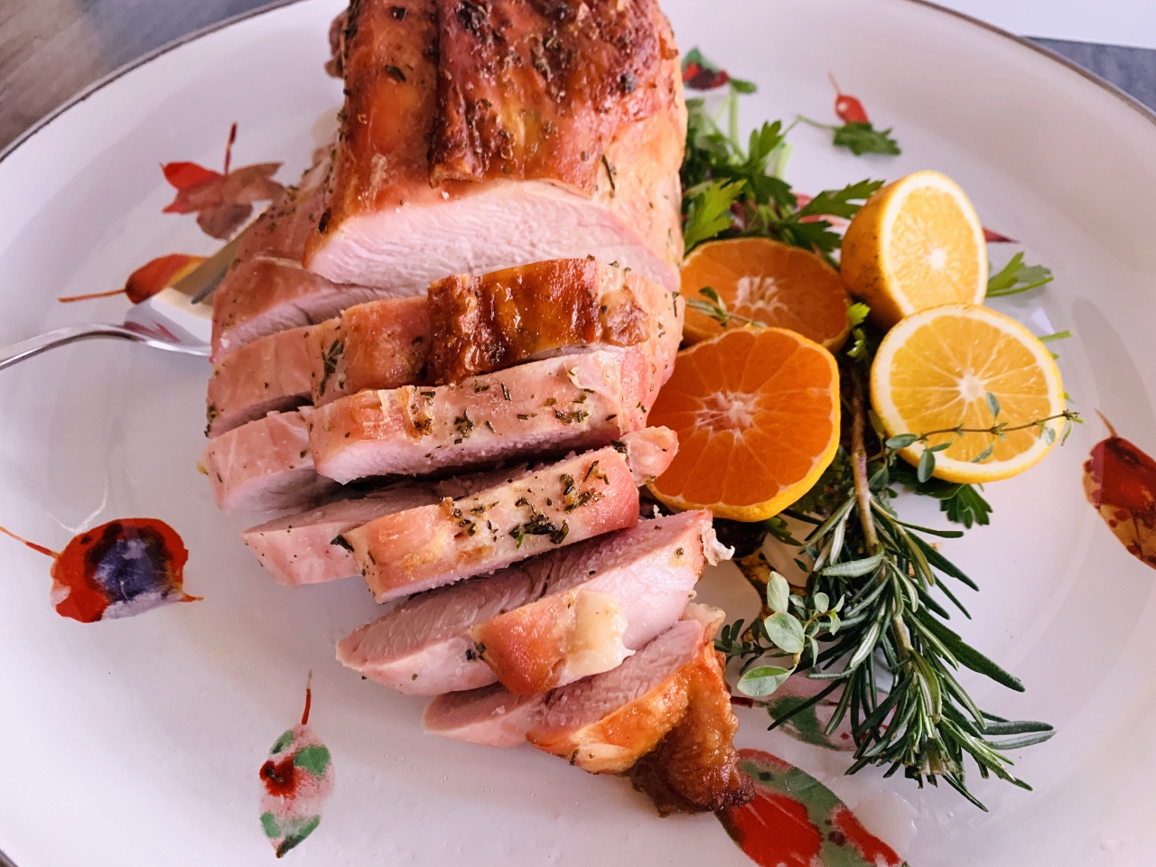 5. Remove turkey from oven and place on a cutting board.  Cover with foil for at least 20 minutes, up to 1 hour.  Slice and serve on platter with more fresh herbs and sliced citrus, if desired.  Enjoy!