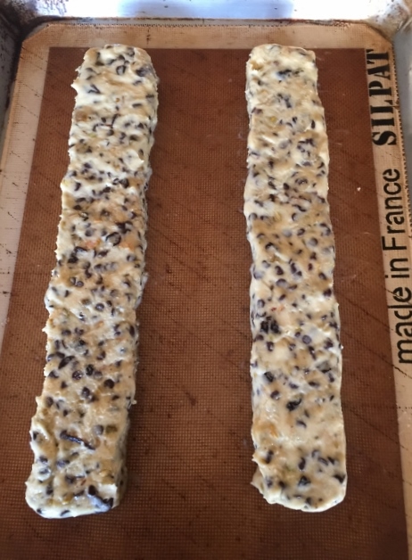 3.  Add fruit, nuts and chocolate to biscotti dough and mix on low until just combined, 30 seconds.  Remove bowl and scrape down sides.  Form dough with lightly damp hands, onto a silpat or parchment lined baking sheet into two 12 x 3 inch logs.