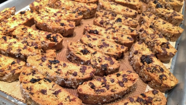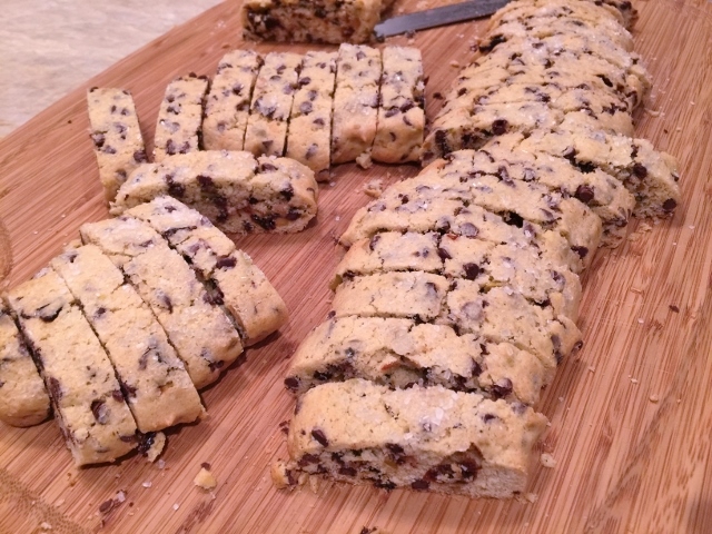 5.  Cut biscotti into 1 1/2 inch slices and place them back on sheet pan to bake again. Bake biscotti for 40-50 minutes, or until dry and firm to touch.  Let biscotti cool and place them in your cookie jar, or serve immediately with a cappuccino or cup of coffee. Enjoy!