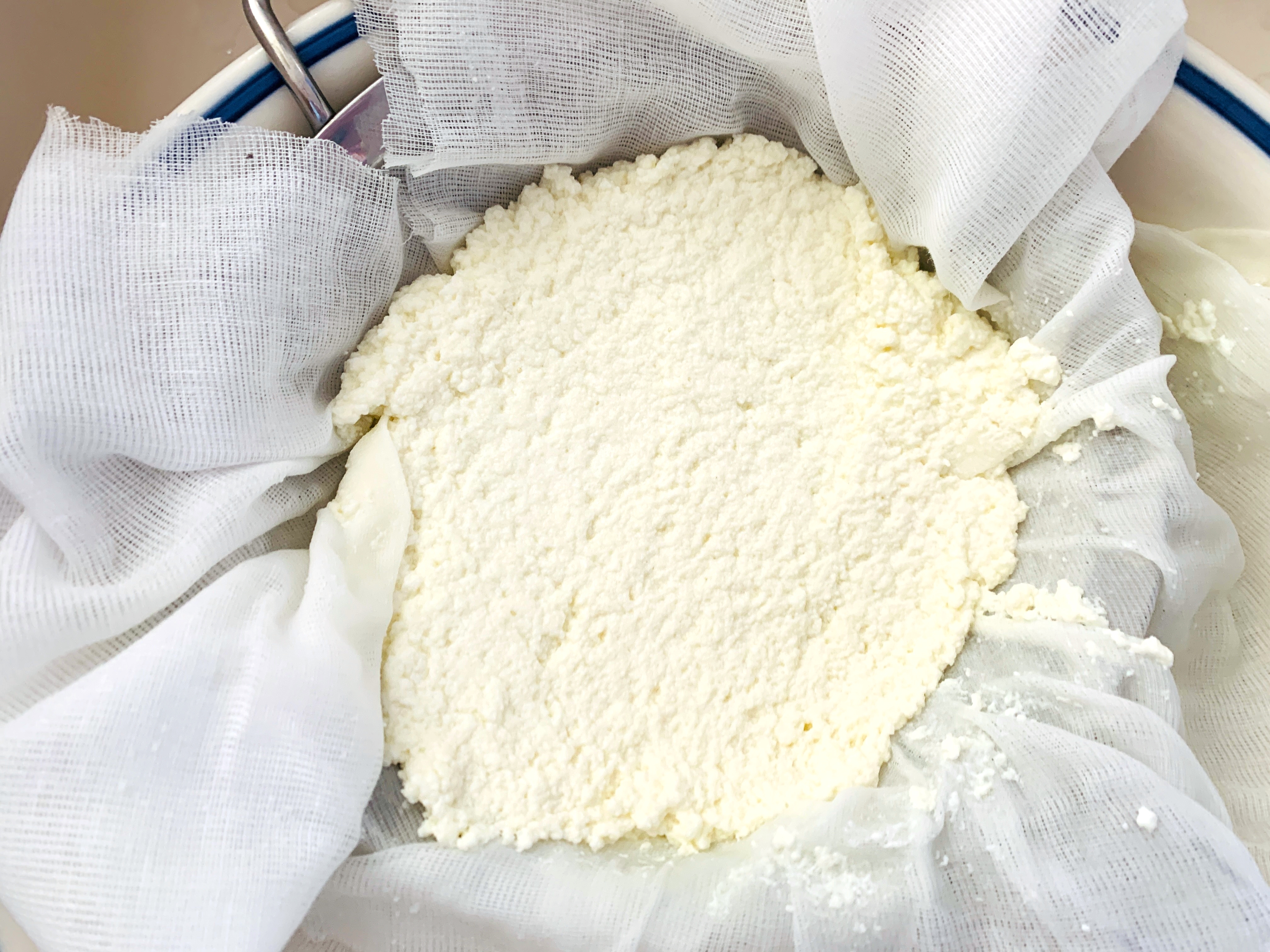In this recipe, I used a half gallon of 1% milk and added a cup of half and half for richness. However, you can make it much creamier by using whole milk and heavy cream. I think the best choice is to use whatever dairy you have on hand and utilize your groceries already purchased. The only other things needed are a lemon and a some white vinegar. A good strainer and some cheesecloth, make it that much easier to prepare, but you can use some paper towels to line a colander, so you don’t need to go out and purchase any additional equipment.