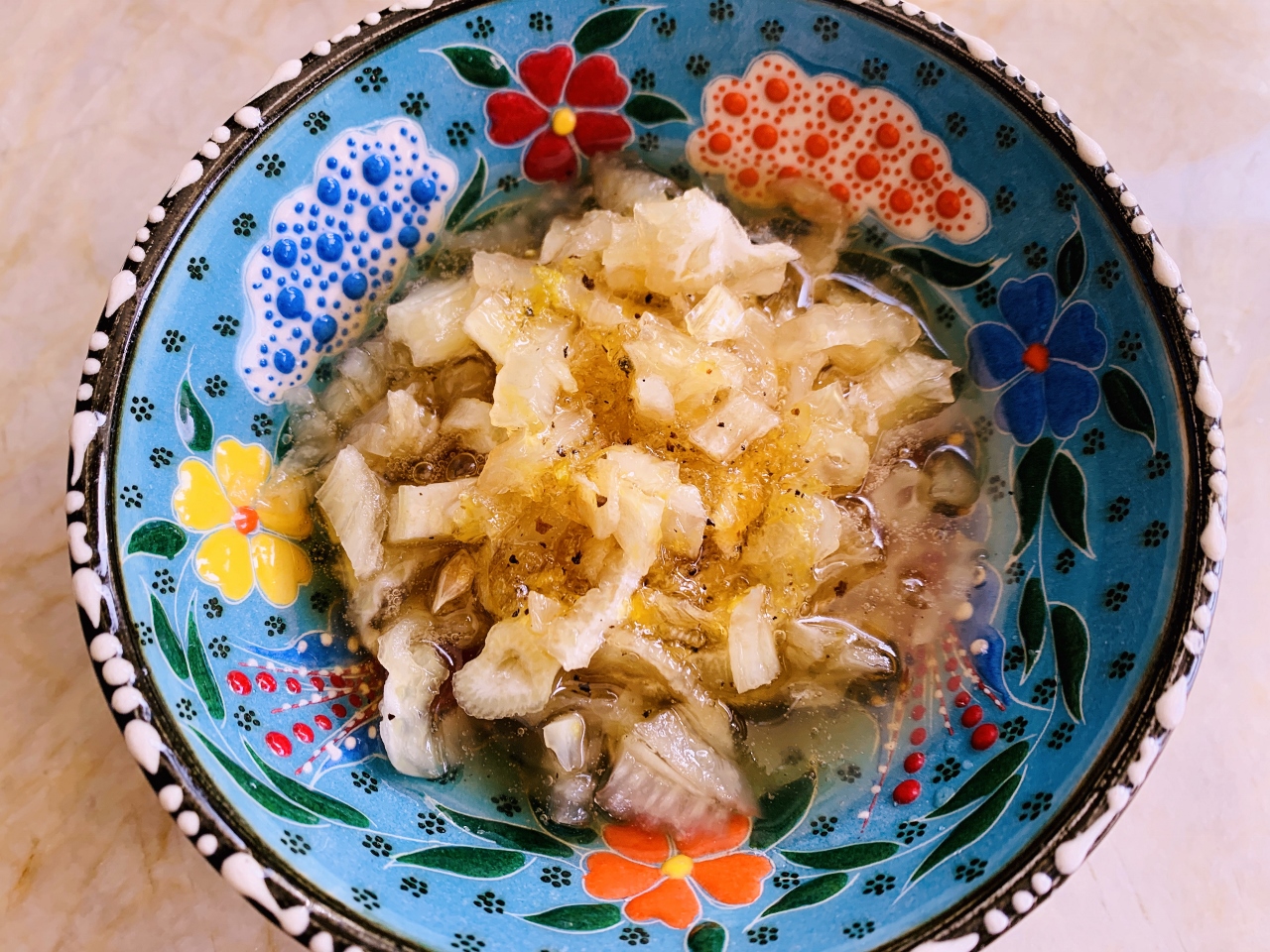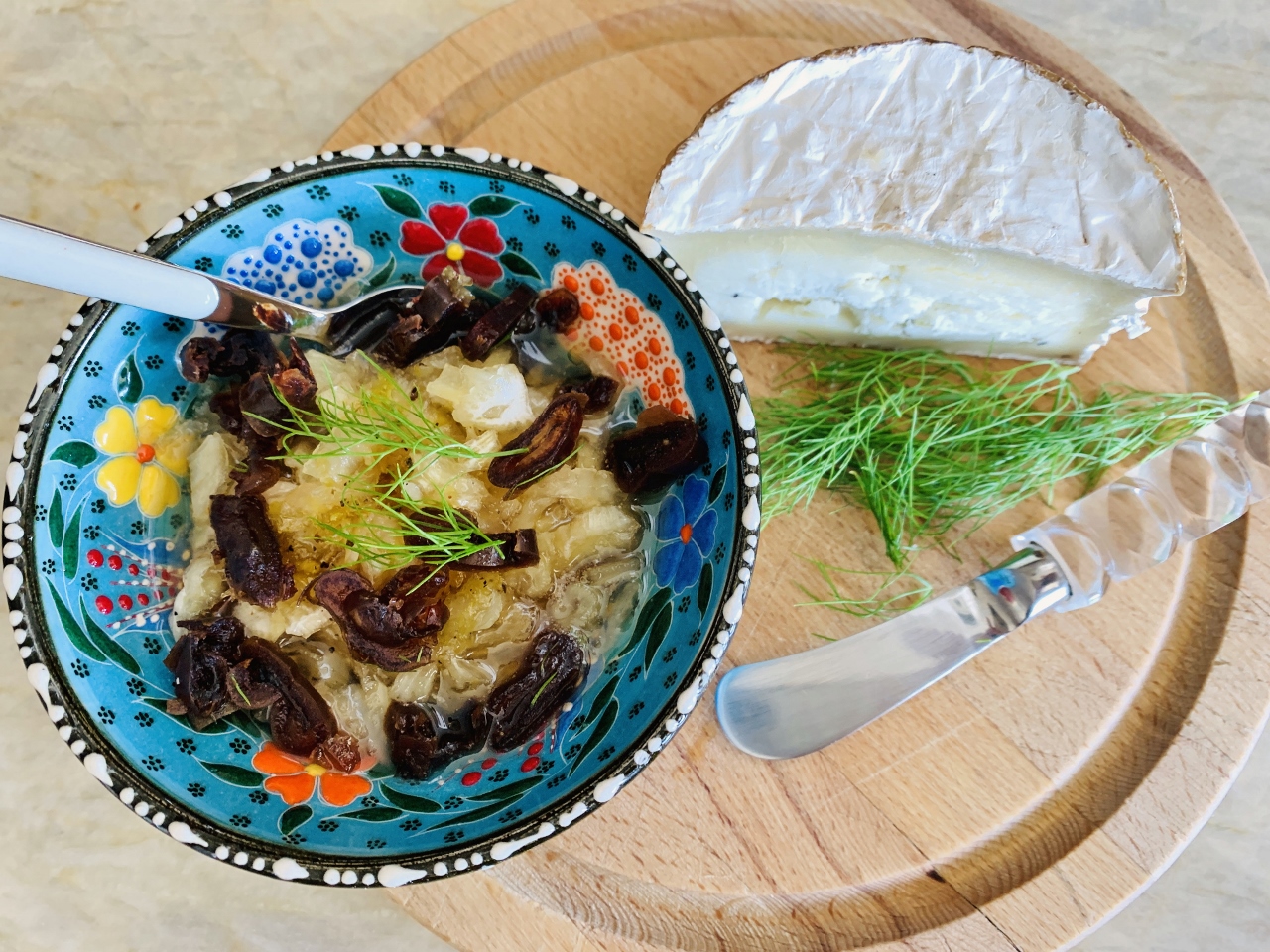 3. Pour hot liquid over fennel in bowl.  After 10 minutes, stir in dates and serve with cheese, or place in refrigerator for a later date.  Enjoy!