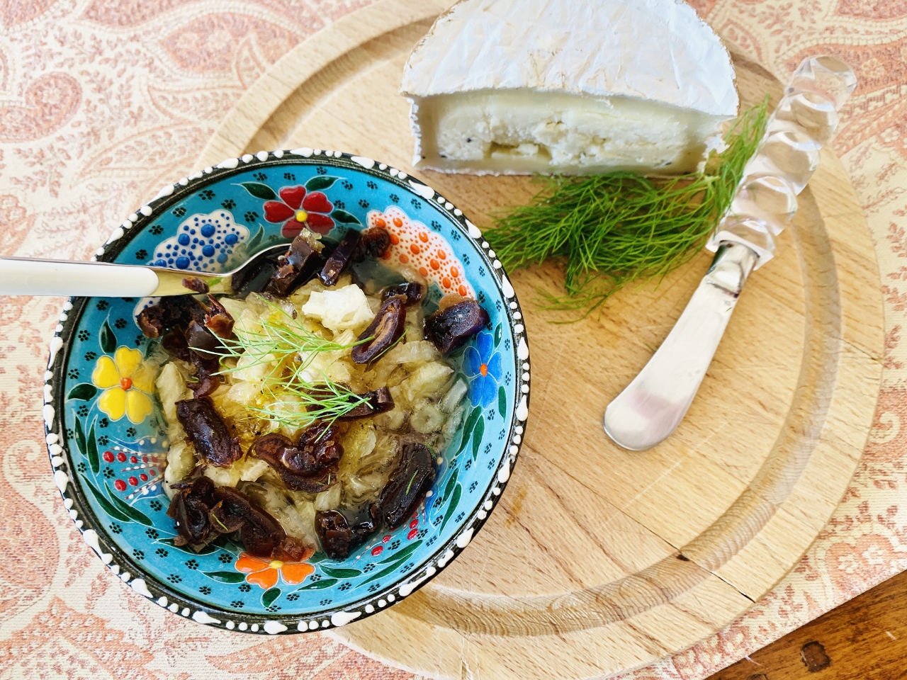 3. Pour hot liquid over fennel in bowl.  After 10 minutes, stir in dates and serve with cheese, or place in refrigerator for a later date.  Enjoy!