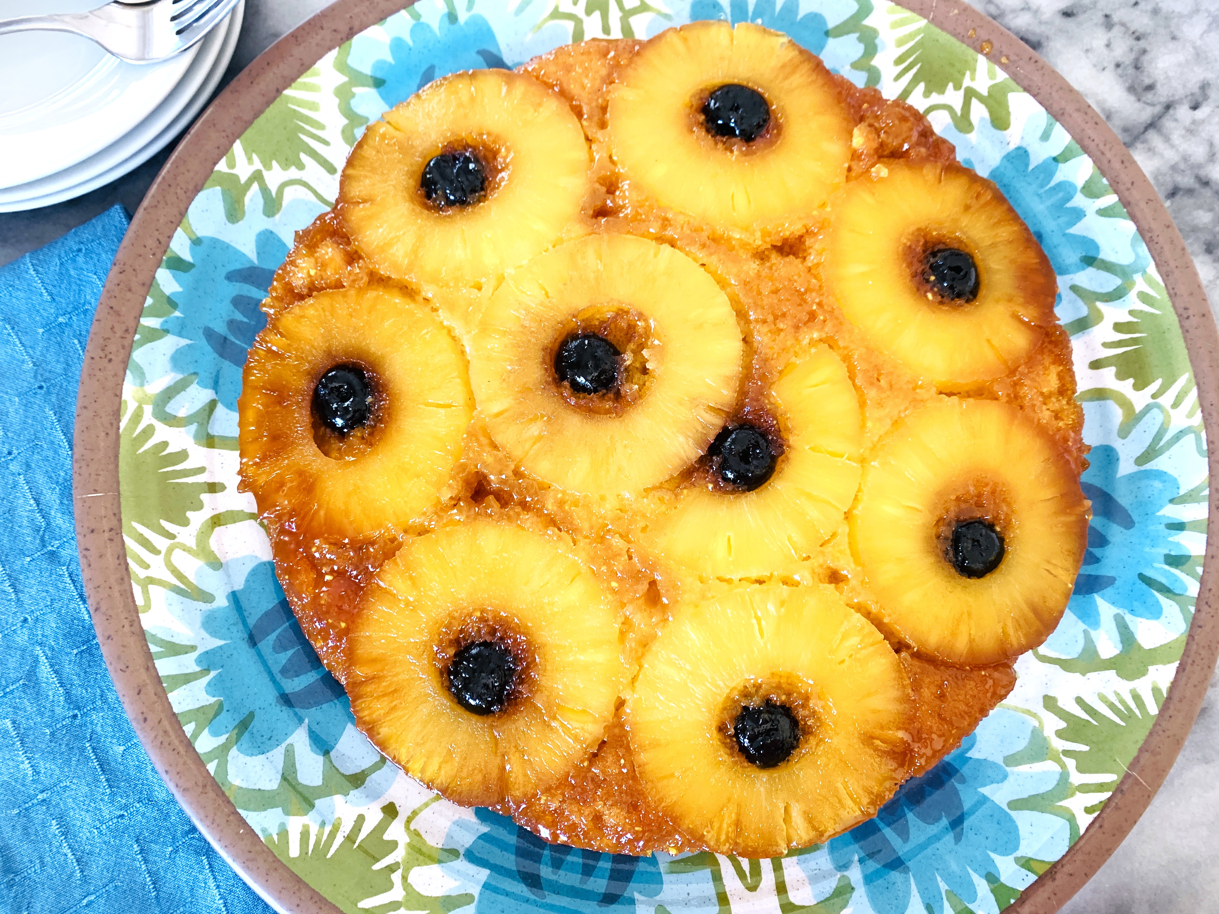 - Spoon batter over pineapple rings and smooth out on top. Bake for 40-45 minutes, or until a toothpick comes clean. Remove and let cool 10 minutes before loosening around edges with knife and inverting onto cake pan or stand.