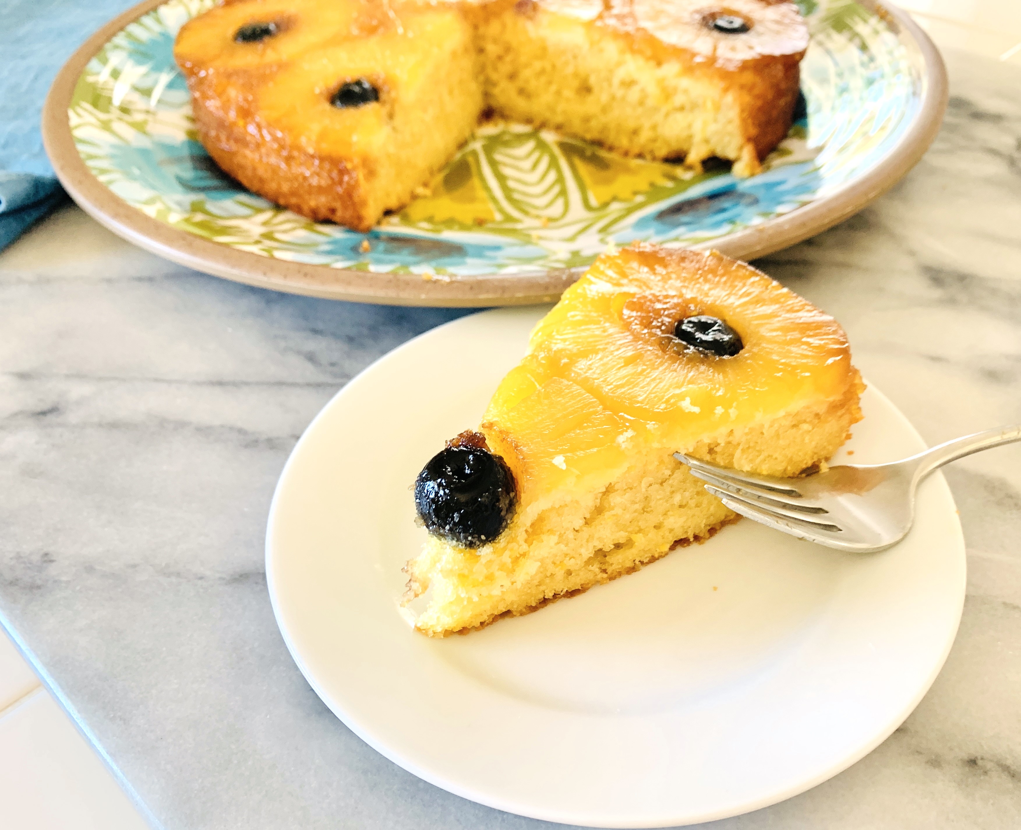 The glaze is made with honey and a pat of butter or two, just melted until combined, then swirled gently in a cake pan. The pineapple rings go on top and the holes are filled with a cherry. I used Luxardo cherries (I use them in cocktails) because those are the ones I have on hand. You can also use fresh cherries, just cut them in half and remove the pit first. As for the batter, it has a bit of cornmeal in it for texture — a good tip I got from Southern Living Magazine. This cake is a simple classic summertime dessert that tastes so good after a meal of barbecue or other grilled foods.