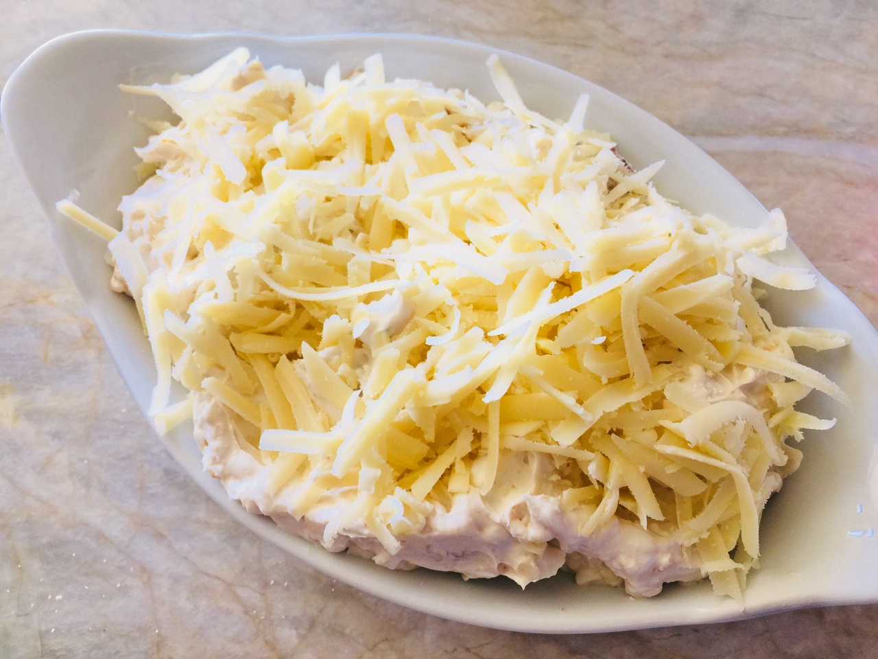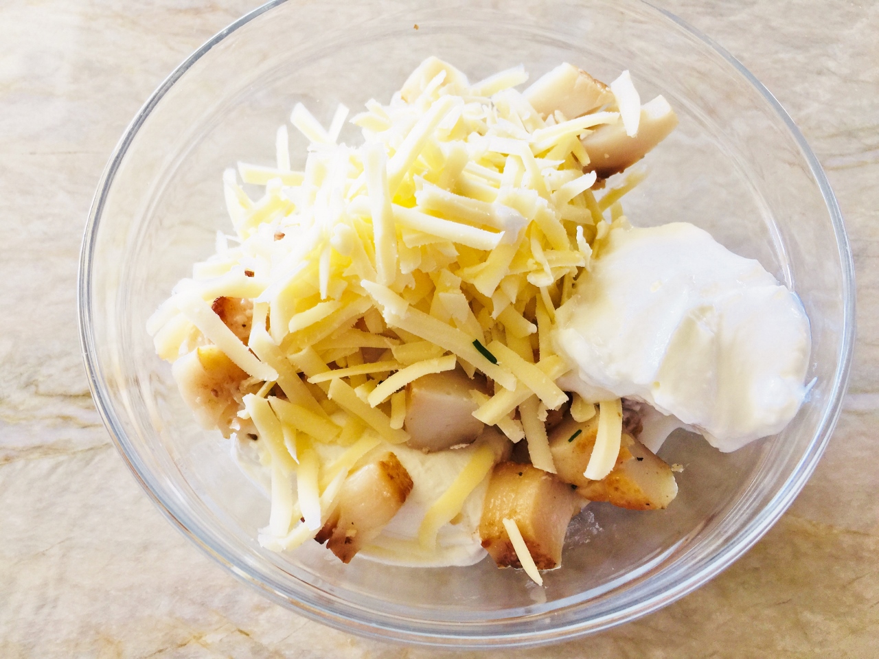 2. Dice scallops into pieces and add to a bowl, along with cream cheese, 1 1/2 cups Gruyere, Worcestershire, onion powder and hot sauce, stir to combine. Add salt and pepper and stir.