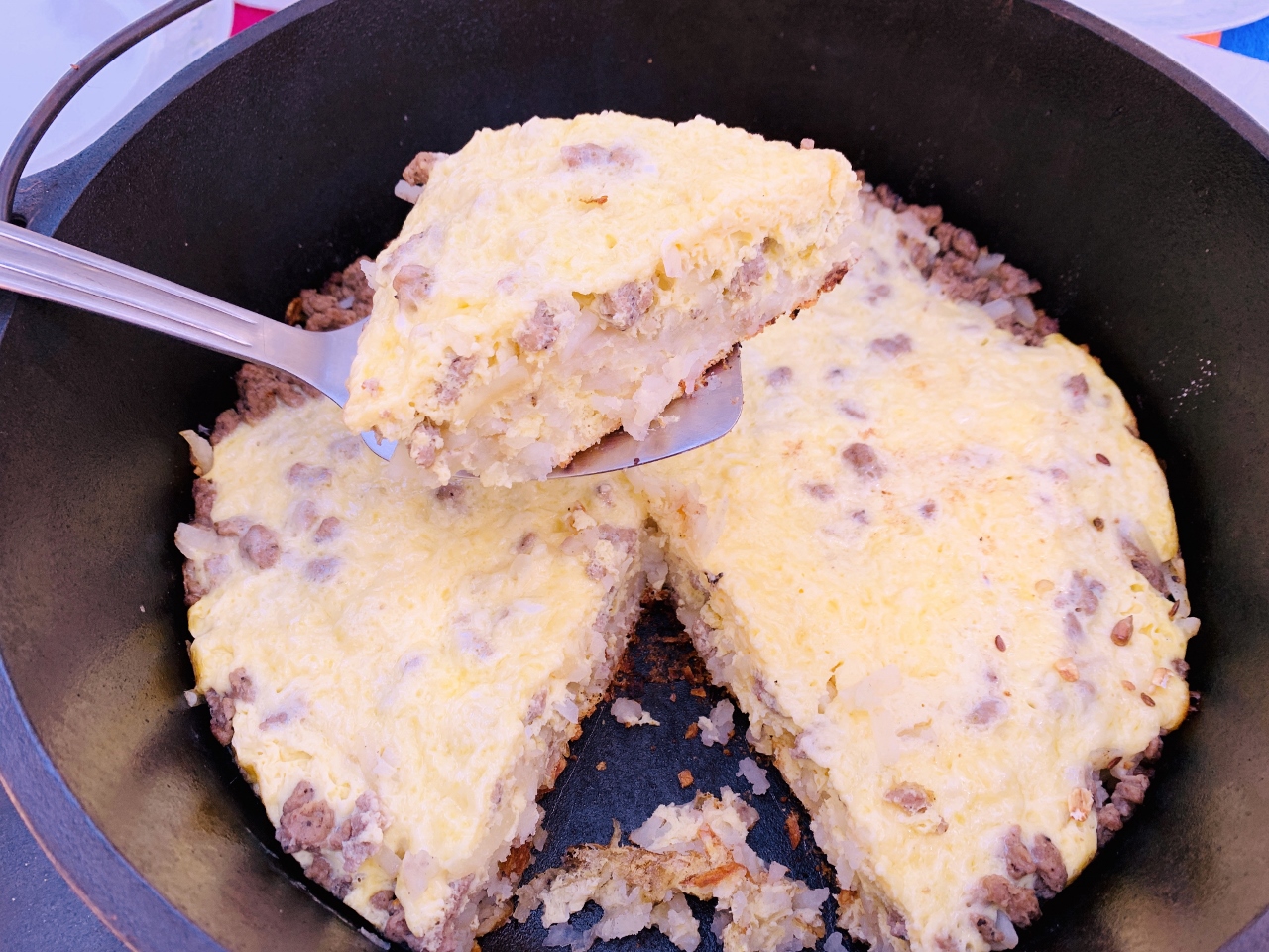 This breakfast recipe is a cinch if you buy ready-made hash browns and pre-cooked sausage crumbles from your grocery store before traveling.  These ingredients make this breakfast fast and furious for those of you who are chomping at the bit to get out and fish, hike or hunt in the early morning.  The layers of potato, sausage, egg and cheese melt into each other and become a rustic crustless quiche slice.  It’s reminiscent of a traditional Spanish Omelette, but with sausage added to the equation.