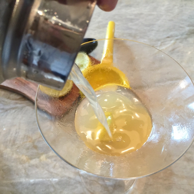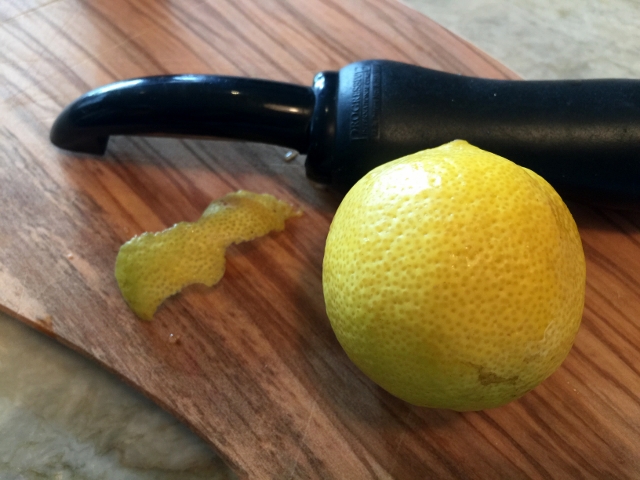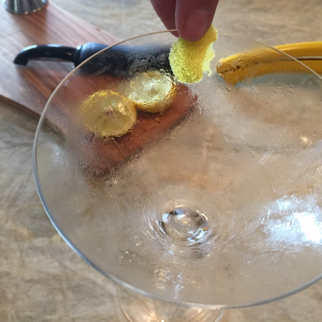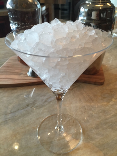 6. Toss the ice out of the glass and rub the zest around the rim of the glass and drop it into the center.