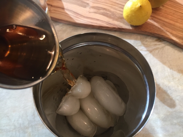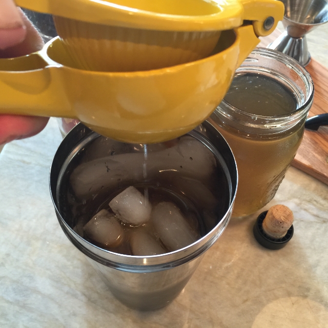 4. Add the juice of half a lemon to the shaker with the Bourbon and Honey Syrup.