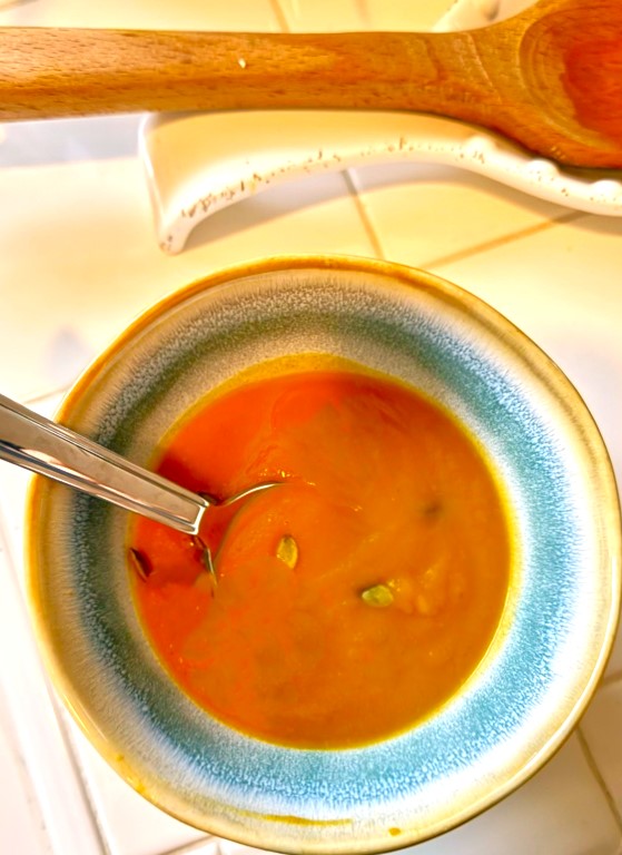 Curry powder is also an ingredient that matters in this soup because it highlights all the other components and builds flavor.  I recommend buying a good quality curry powder or blending your own.  The taste of this butternut squash soup is pure luxury in a bowl and a few toasted pepitas on top after ladling it into bowls adds the perfect crunch.