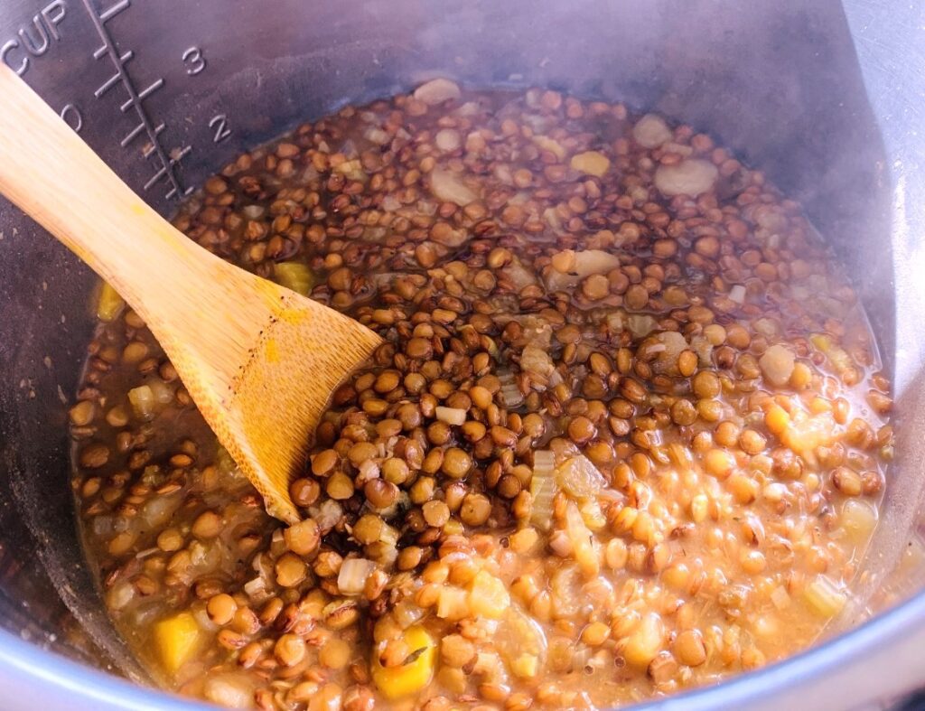 - Add rinsed lentils and stir to combine. Pour in broth and stir. Hit Cancel.