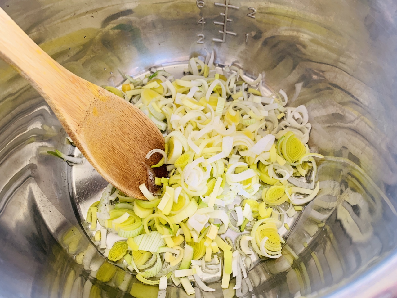 - Press Saute on Instant Pot and drizzle with 2 teaspoons oil. Add leeks and saute for 2 minutes. Add carrots and celery and saute for 1 minute. Add salt, cumin and thyme and stir.